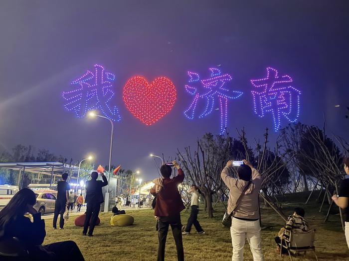 “快看,开始了!”随着人群中一声欢呼,游客们纷纷举起手机拍照。“是五星红旗”“是鹊山和华山”“我爱济南”……随着无人机灯光秀演绎的画面不断变化,人群中不时有游客喊出声来,孩童们不时发出“哇”声。